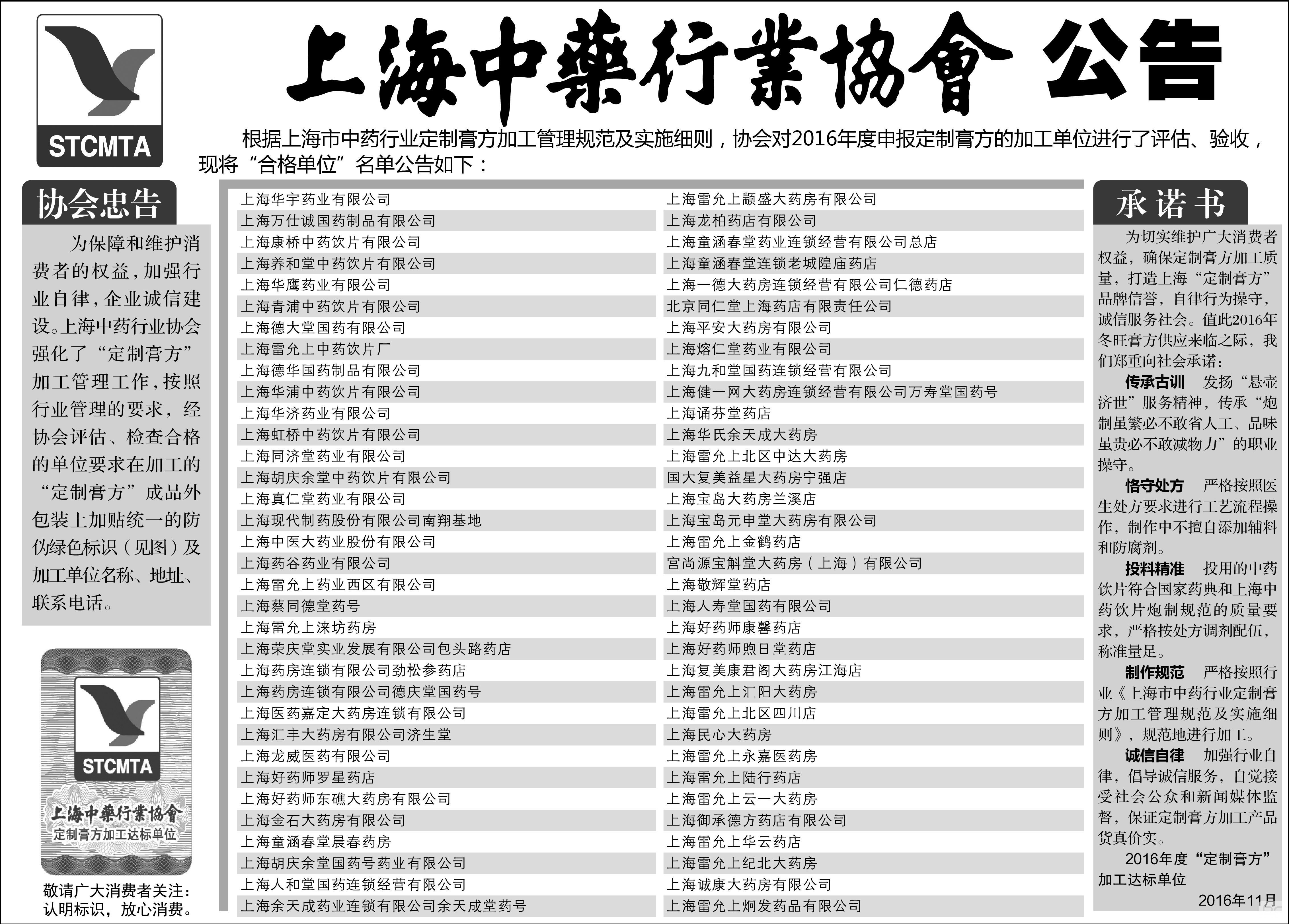 市商联会2016年度上海中药行业商业先进名单正式公布