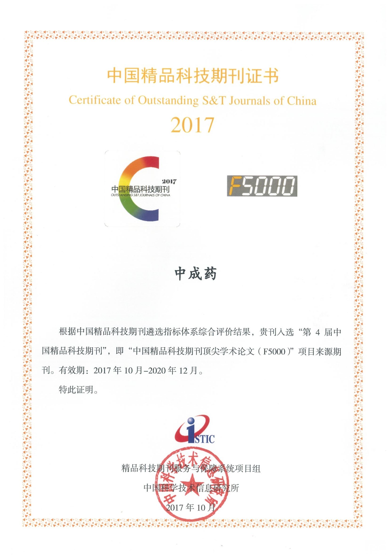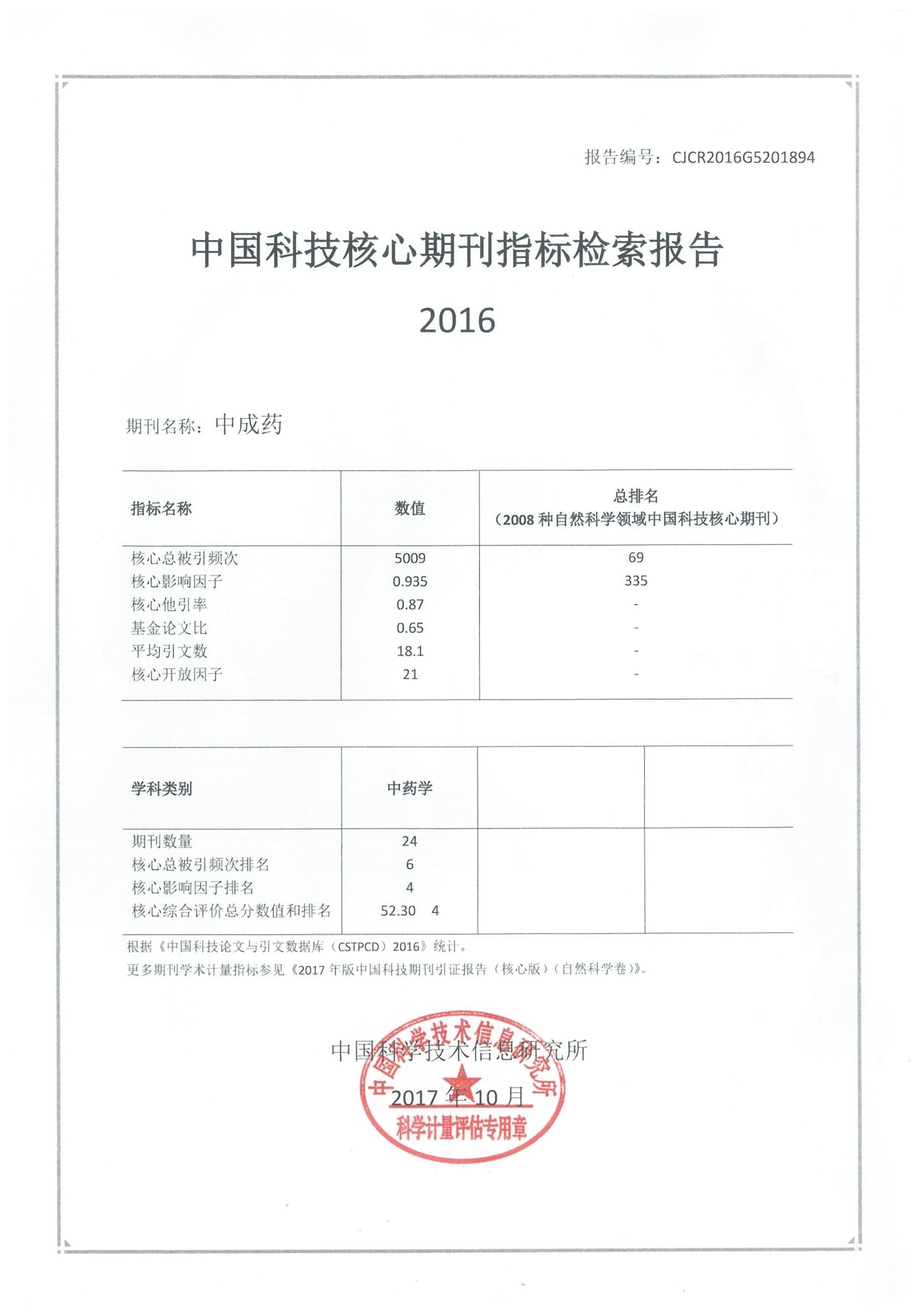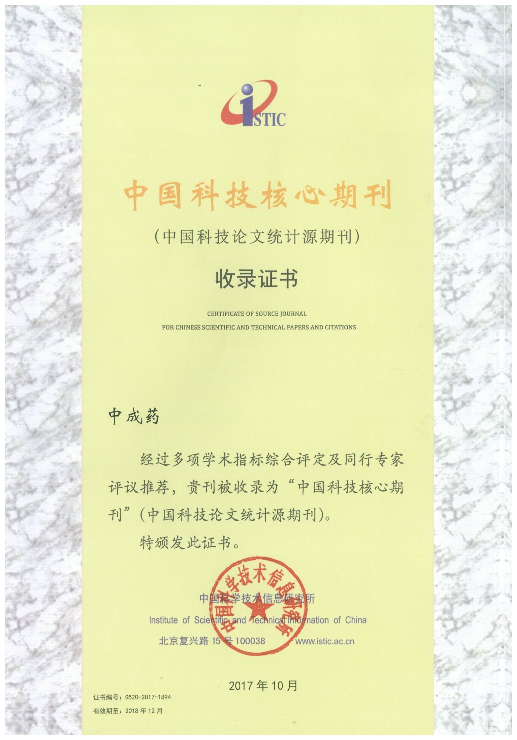 2017年10月31日中国科学技术信息研究所发布2017年《中国科技期刊引证报告》(核心版):《中成药》核心影响因子0.935,核心总被引频次5 009,荣获中国精品科技期刊。
