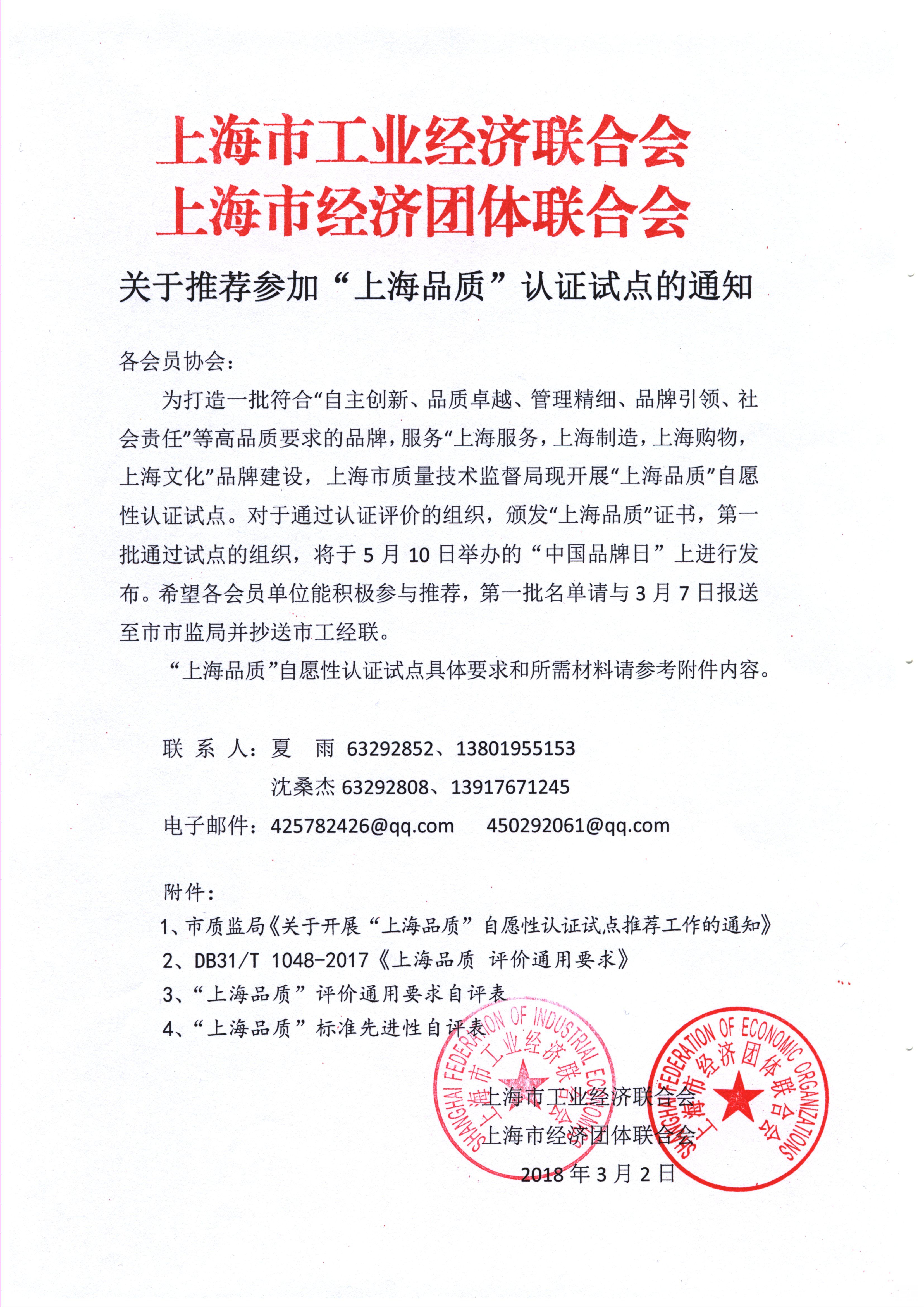 1.市质监局《关于推荐参加“上海品质”自愿性认证试点推荐工作的通知》