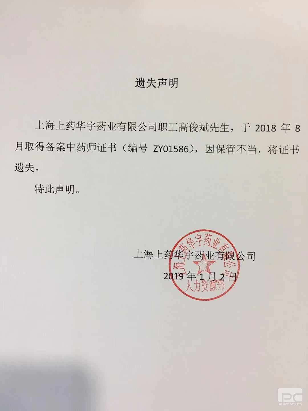 备案中药师证书遗失声明