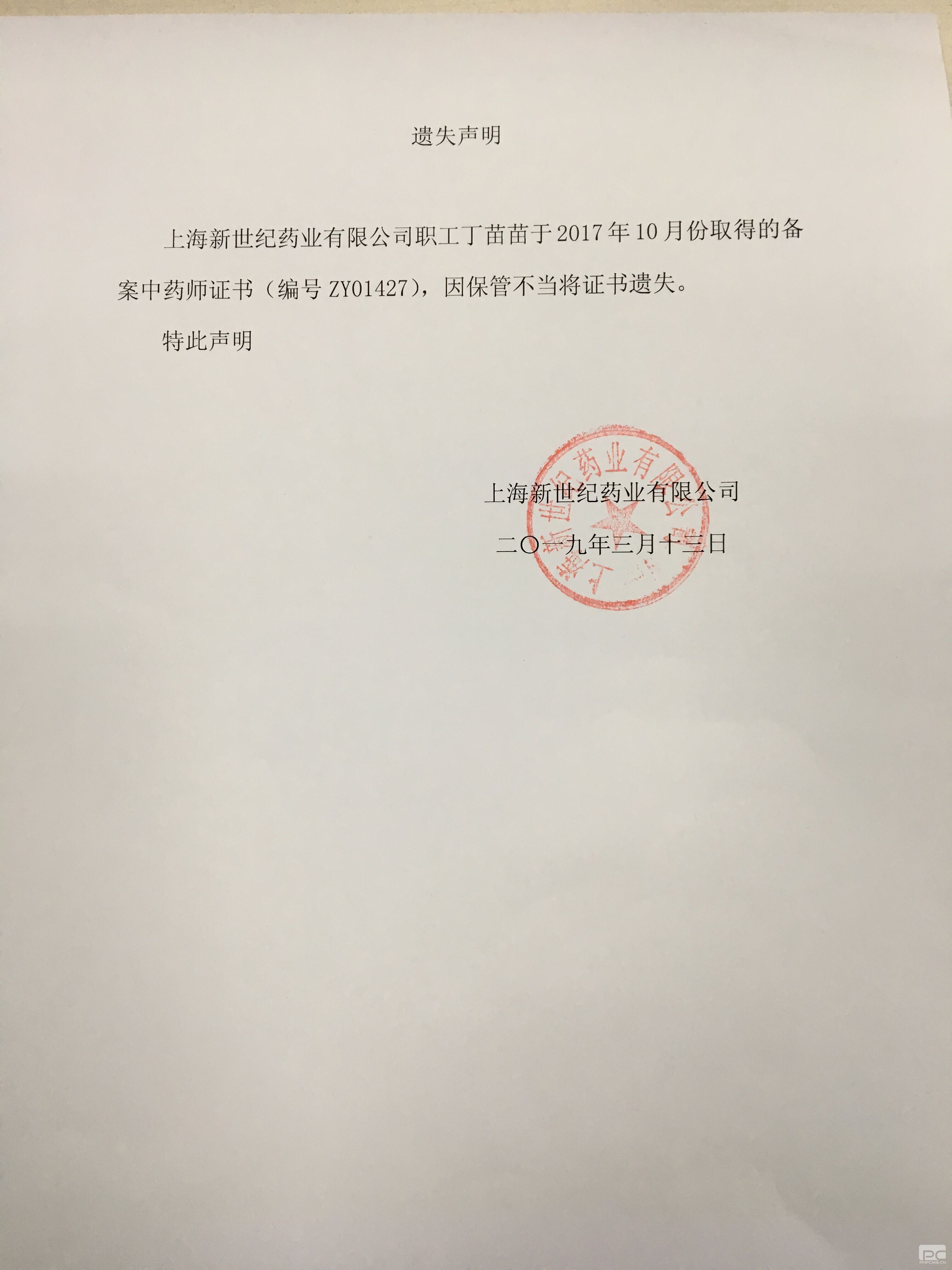 备案中药师证书遗失声明