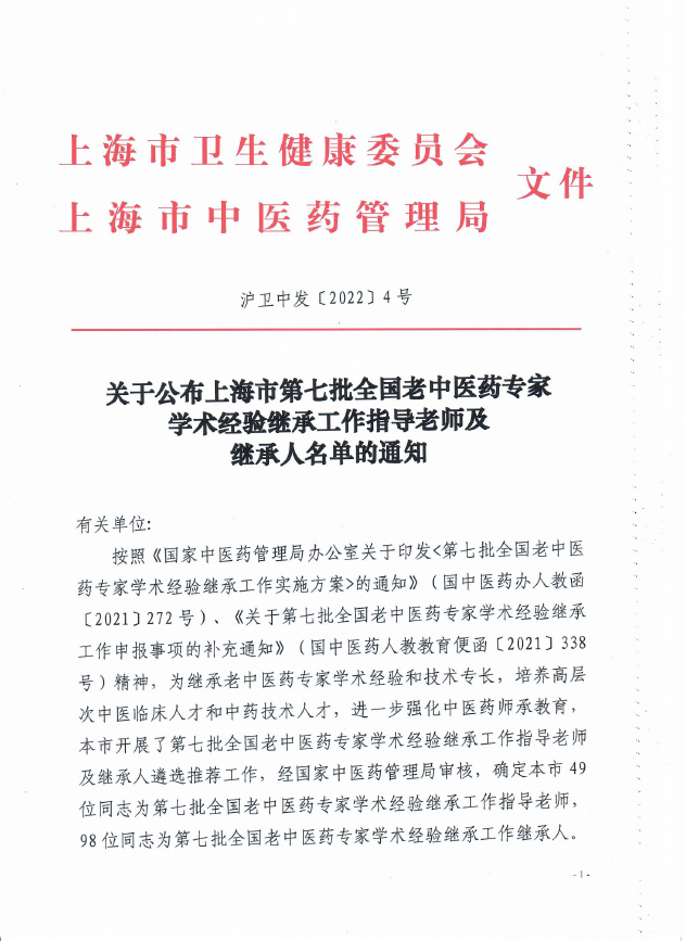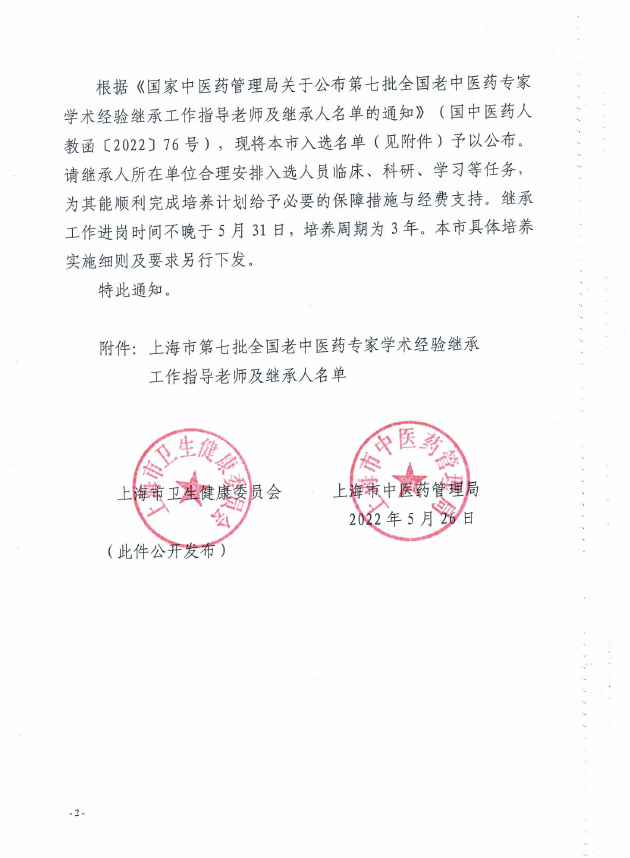 按照《国家中医药管理局办公室关于印发<<第七批全国老中医药专家学术经验继承作实施方案>的的通知》(国中医药办人教函[2021272号)、《关于第七批全国老老中医药专家学术经验继承工作申报事项的补充通知》(国中医药药人教教育便函〔2021338号)精神,为继承老中医药专家学术经经验和技术专长,培养高层次中医临床人才和中药技术人才,进一步强化中医药师承教育,本市开展了第七批全国老中医药专家学学术经验继承工作指导老师及继承人議选推荐工作,经国家中医药管理局审核,确定本市49位同志为第七批全国老中医药专家学术术经验継承工作指导老师,98位同志为第七批全国老中医药专家学术术经验继承工作继承人。上海市药材有限公司叶愈青作为指导老师和上海市医药学校傅颖、上海市药材有限公司杨勇作为继承者入选。