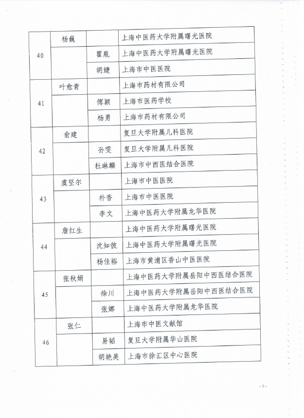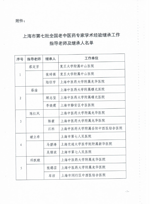 叶愈青和傅颖、杨勇入选上海市第七批全国老中医药专家学术经验继承工作指导老师及继承人名单