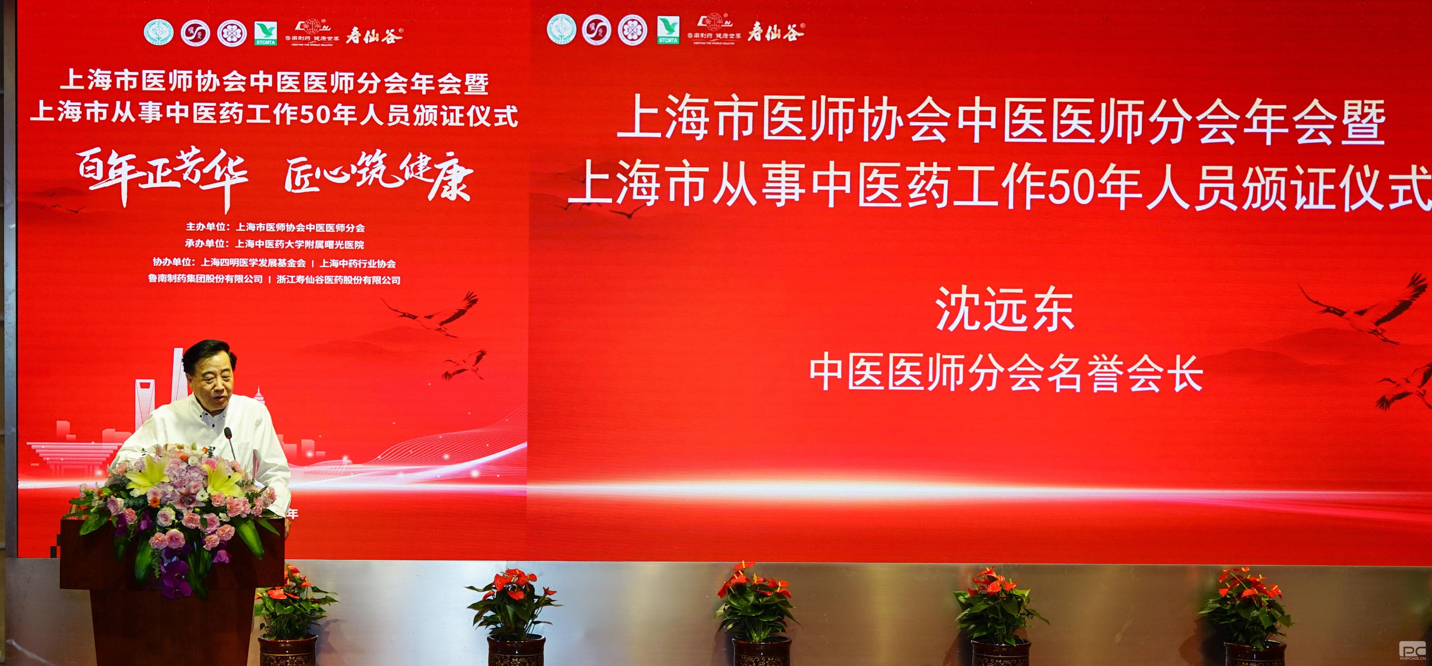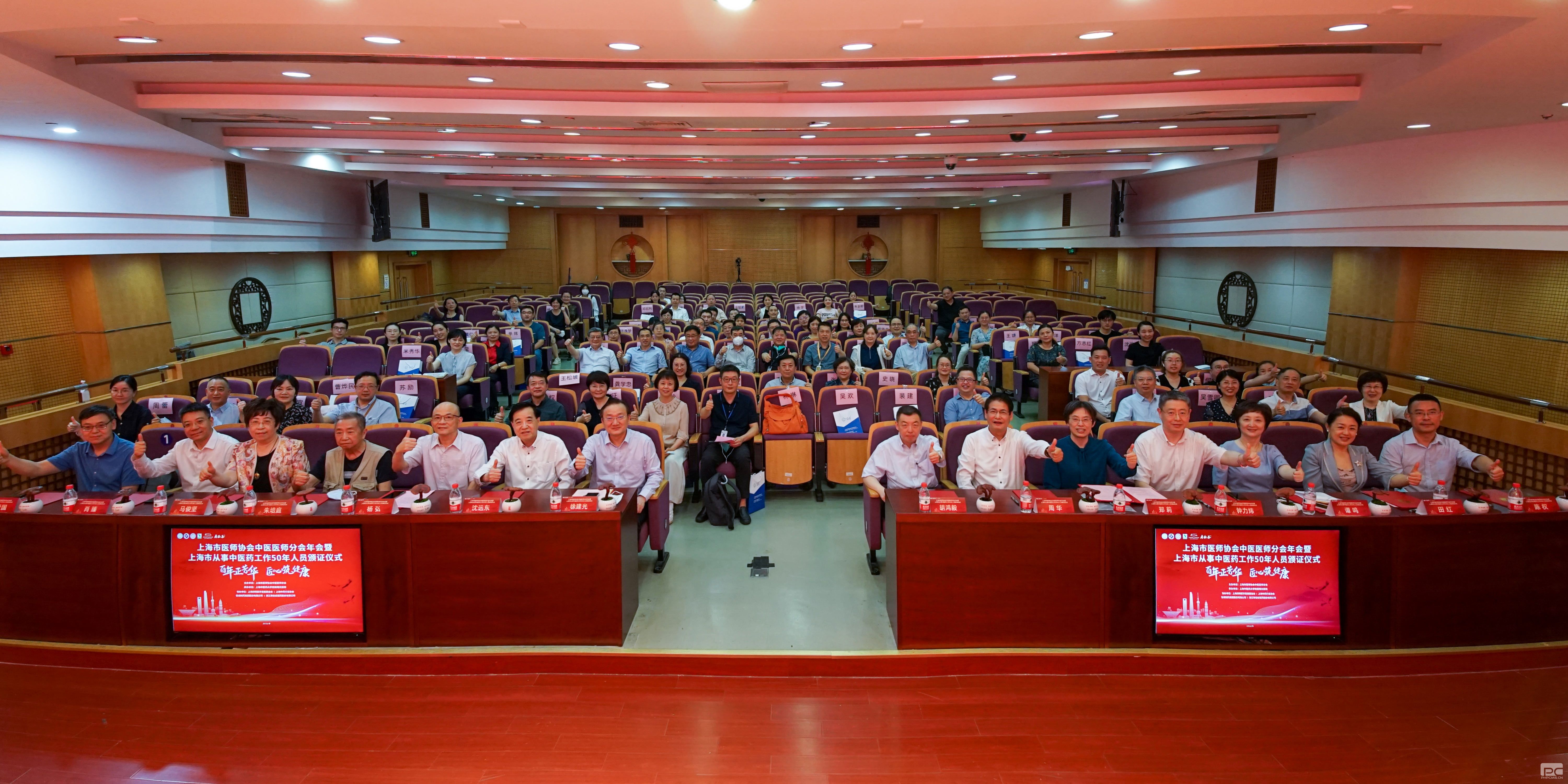 7月22日下午,上海市医师协会中医医师分会年会暨上海市从事中医药工作50年人员颁证仪式在曙光医院东院会议厅举行,出席大会的领导有:上海市人大教育科学文化卫生委员会主任委员、上海市医师协会会长、上海市医学会会长、 上海中医药大学校长徐建光教授;上海市卫生健康委副主任、上海市中医药管理局副局长胡鸿毅教授;上海市医师协会中医医师分会首任会长、第三届中医医师分会名誉会长沈远东教授;上海市医师协会常务副会长、上海市医学会常务副会长兼秘书长谭鸣教授及田红秘书长;上海市医师协会监事会监事、上海四明医学发展基金会理事长马俊坚教授;上海市卫生健康委、上海市中医药管理局中医药传承发展处聂爱国副处长;上海中药行业协会会长杨弘教授及孙帆副秘书长等。