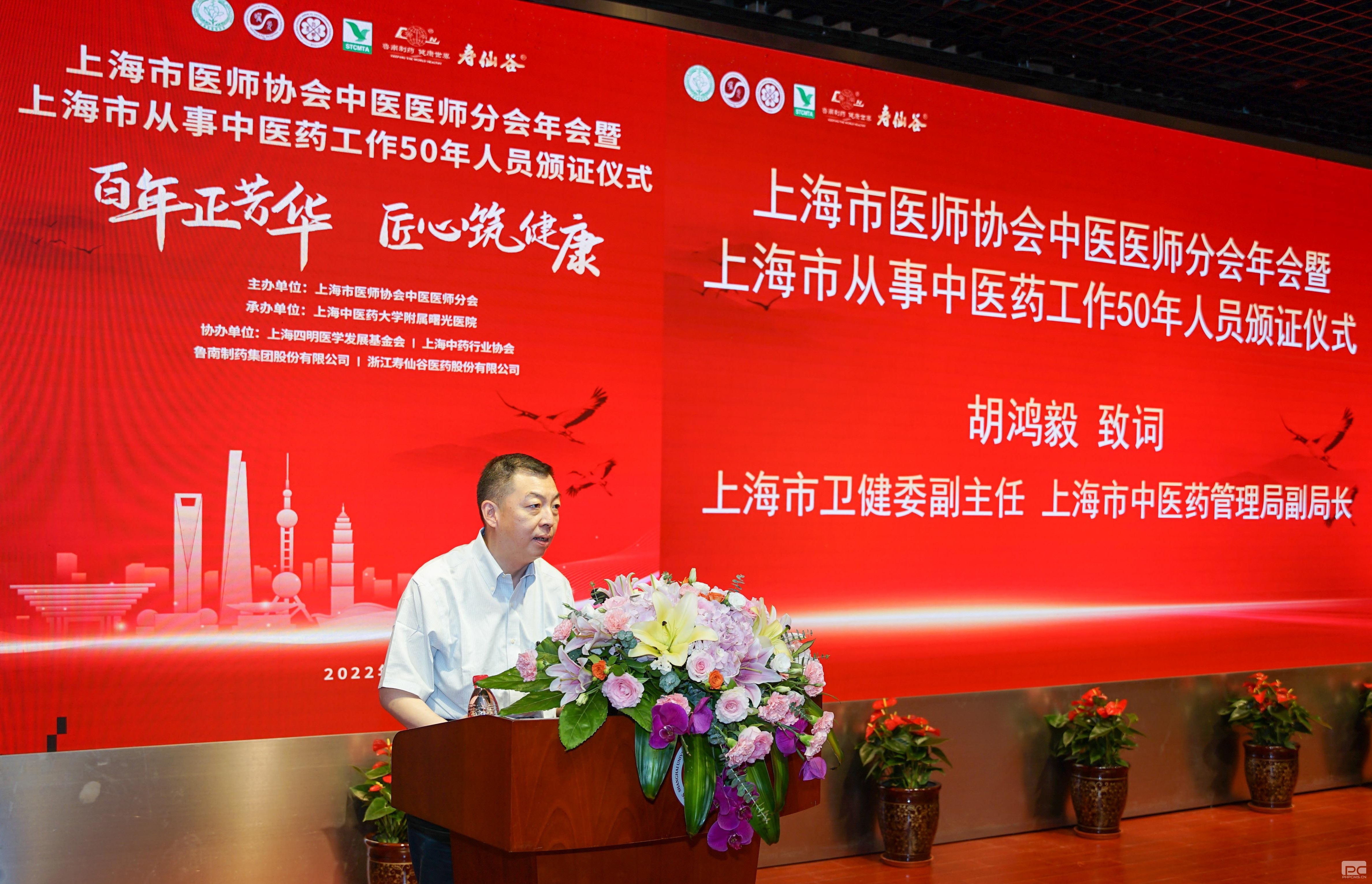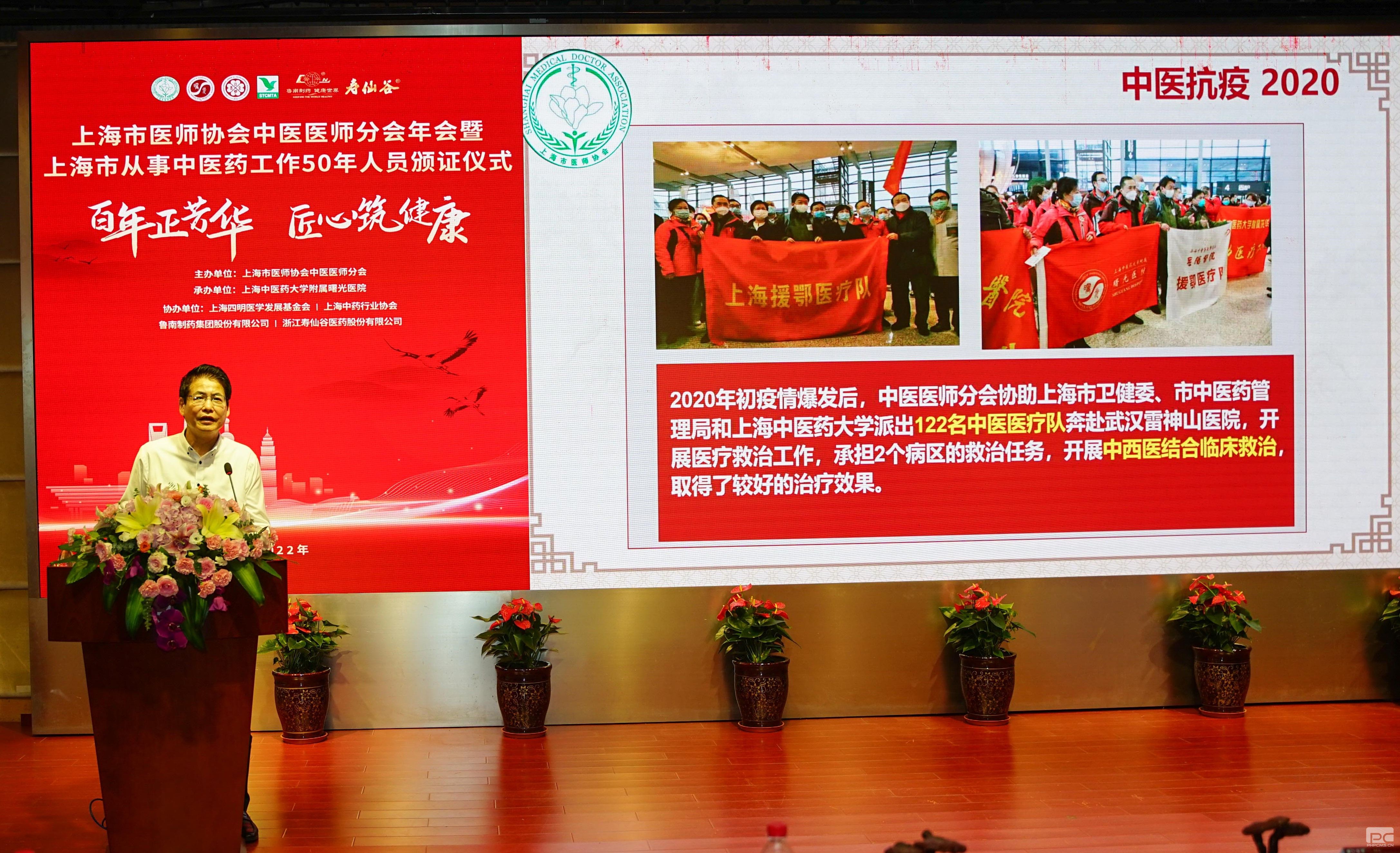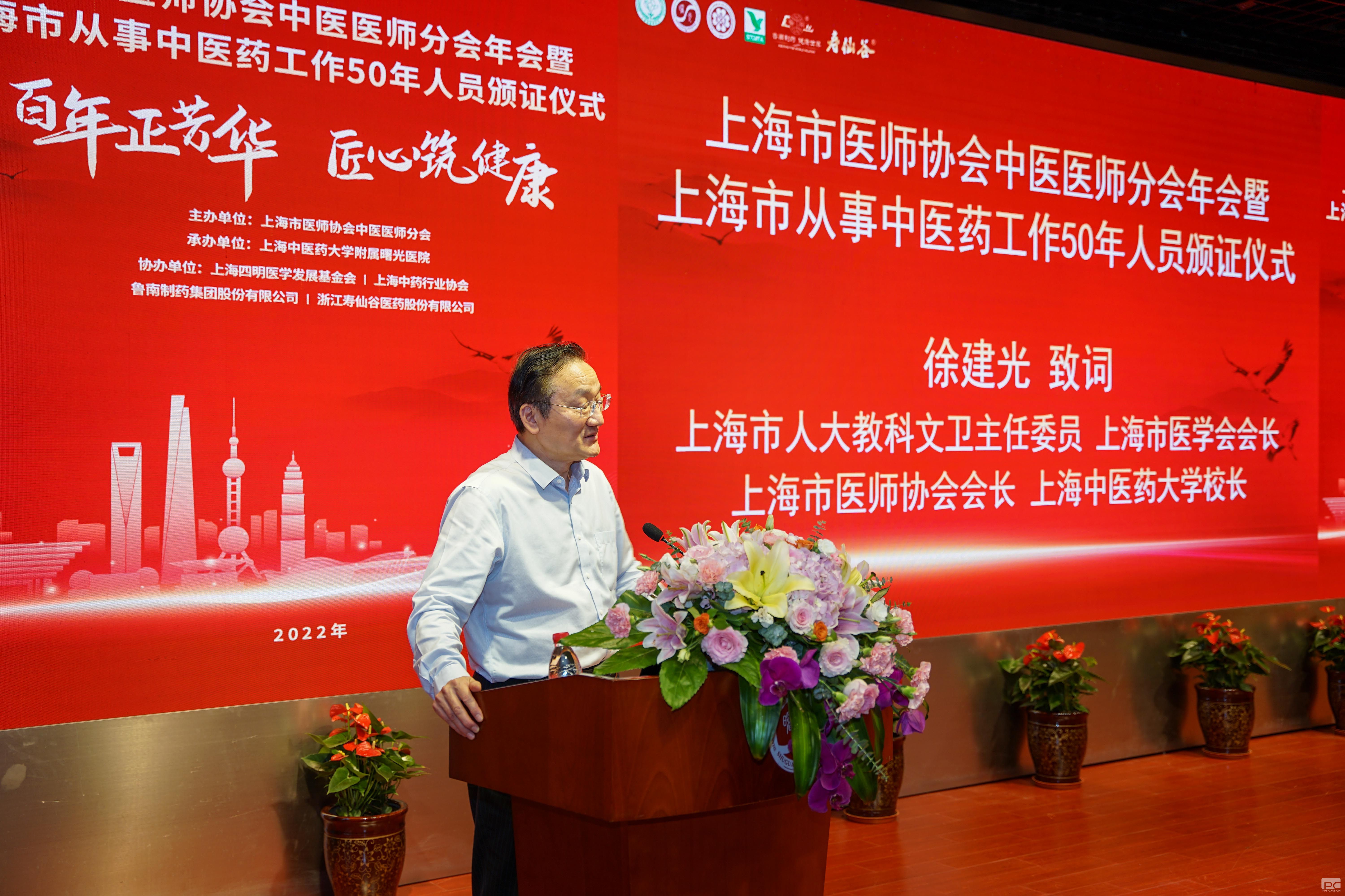 胡鸿毅副主任和徐建光会长分别致辞,充分肯定了中医医师分会长期以来团结上海中医师努力进取,弘扬国粹,尤其是上海中医药人在疫情大上海保卫战中的突出表现,中医药合作提供防疫方5000万帖;以及圆满完成政府交办的每年度向上海市从事中医药工作50年人员颁证工作。同时向今年获得上海市从事中医药工作50年人员表示祝贺,指出中医药事业发展关键在人才,要将中医药一代一代传承好,做好本市中医药传承创新发展工作,激励广大中医药从业人员不忘初心、砥砺前行,不断增强广大中医药工作者光荣感、使命感和责任感,