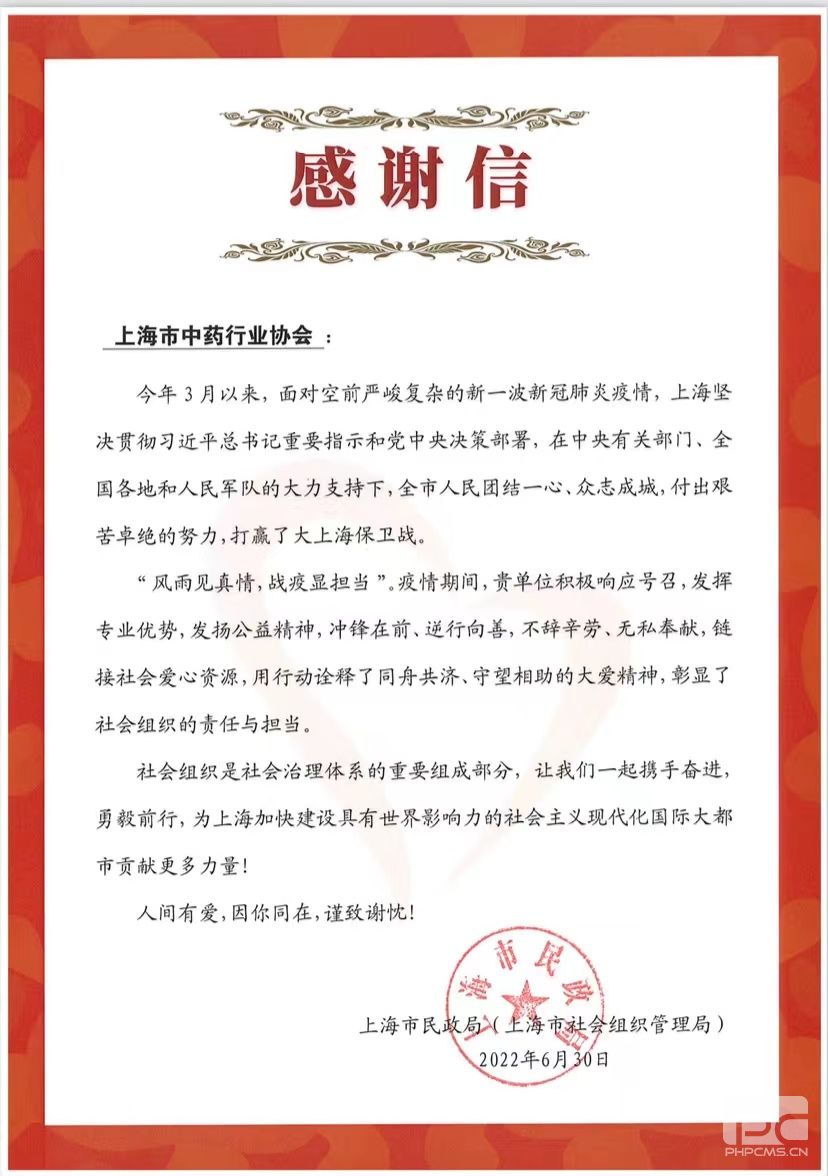 近日,上海市民政局 (上海市社会组织管理局)给上海中药行业协会发来感谢信,对协会积极响应号召,发挥专业优势,发扬公益精神,冲锋在前、逆行向善,不辞辛劳、无私奉献,链接社会爱心资源,用行动诠释了同舟共济、守望相助的大爱精神,彰显了社会组织的责任与担当表示感谢。“风雨见真情,战疫显担当”。