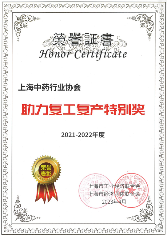 4月12日在市政协会场召开的上海市工业经济联合会、上海市经济团体联合会第六届四次会员大会暨理事会颁奖仪式颁奖仪式上,上海中药行业协会被授予2021-2022年度“先进协会标杆”荣誉称号和“助力复工复产特别奖”,协会会长张聪出席颁奖仪式并登台领奖。