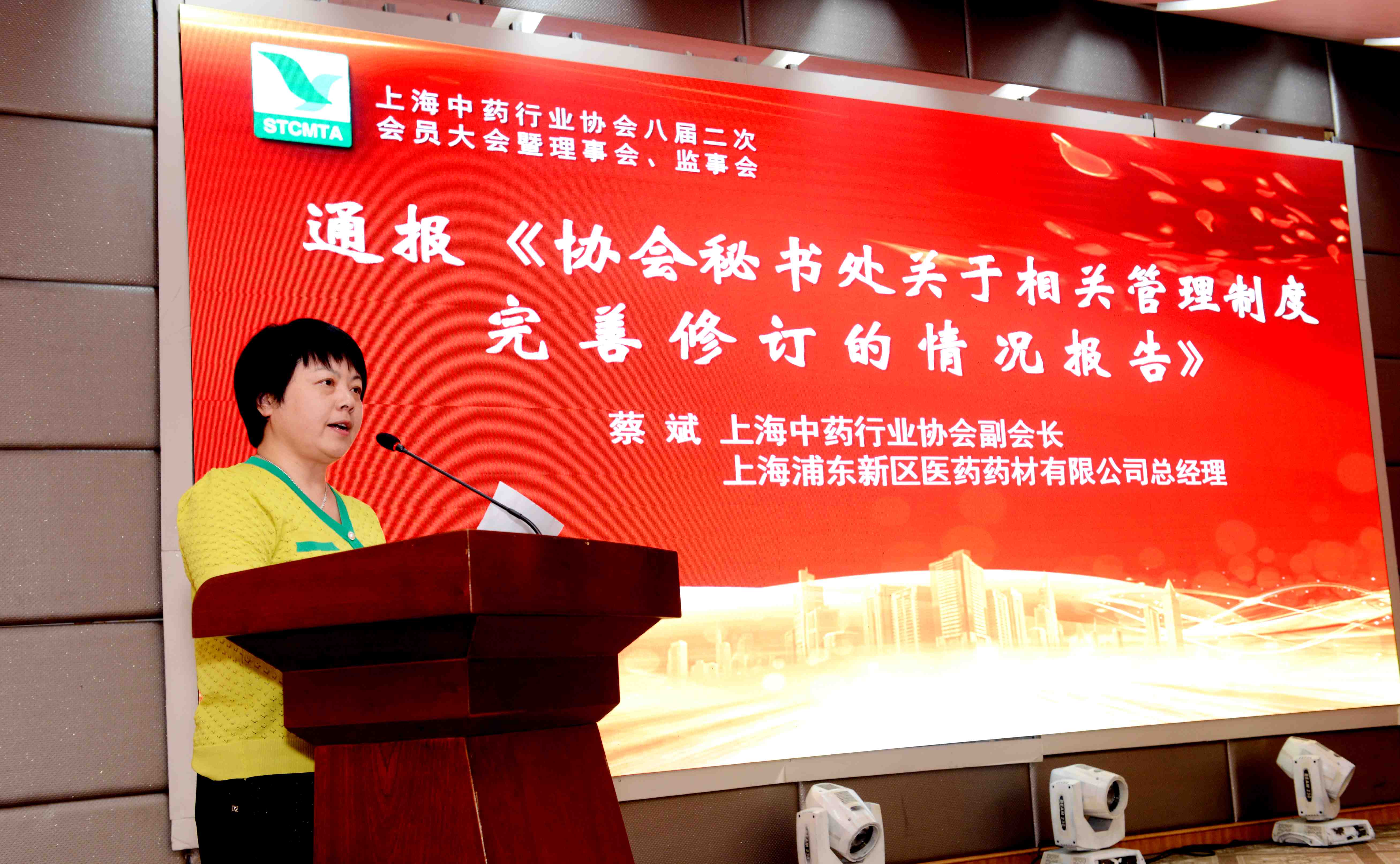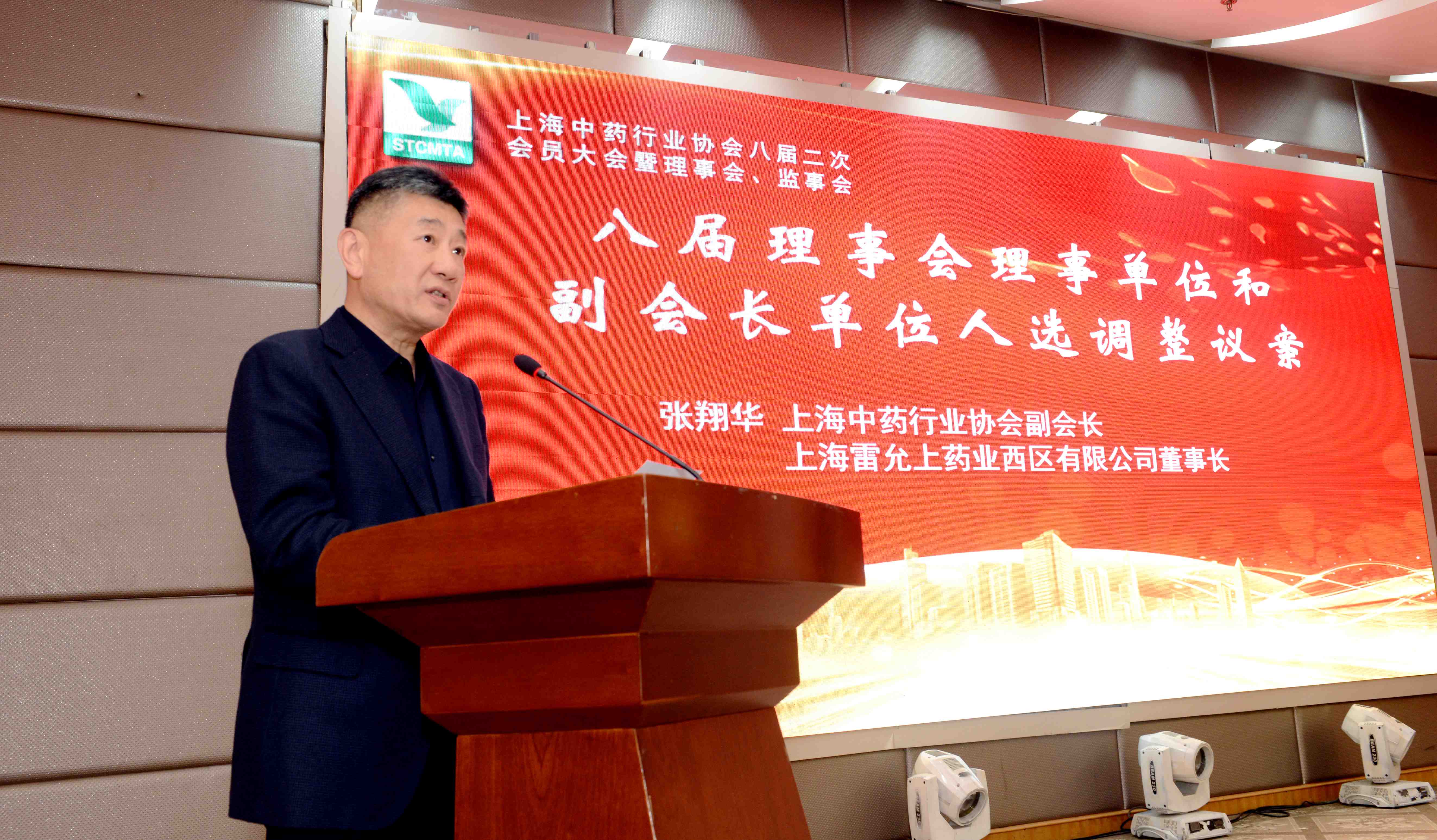 协会副会长、上海雷允上药业西区有限公司董事长张翔华作《八届理事会理事单位和副会长单位人选调整的议案报告》。