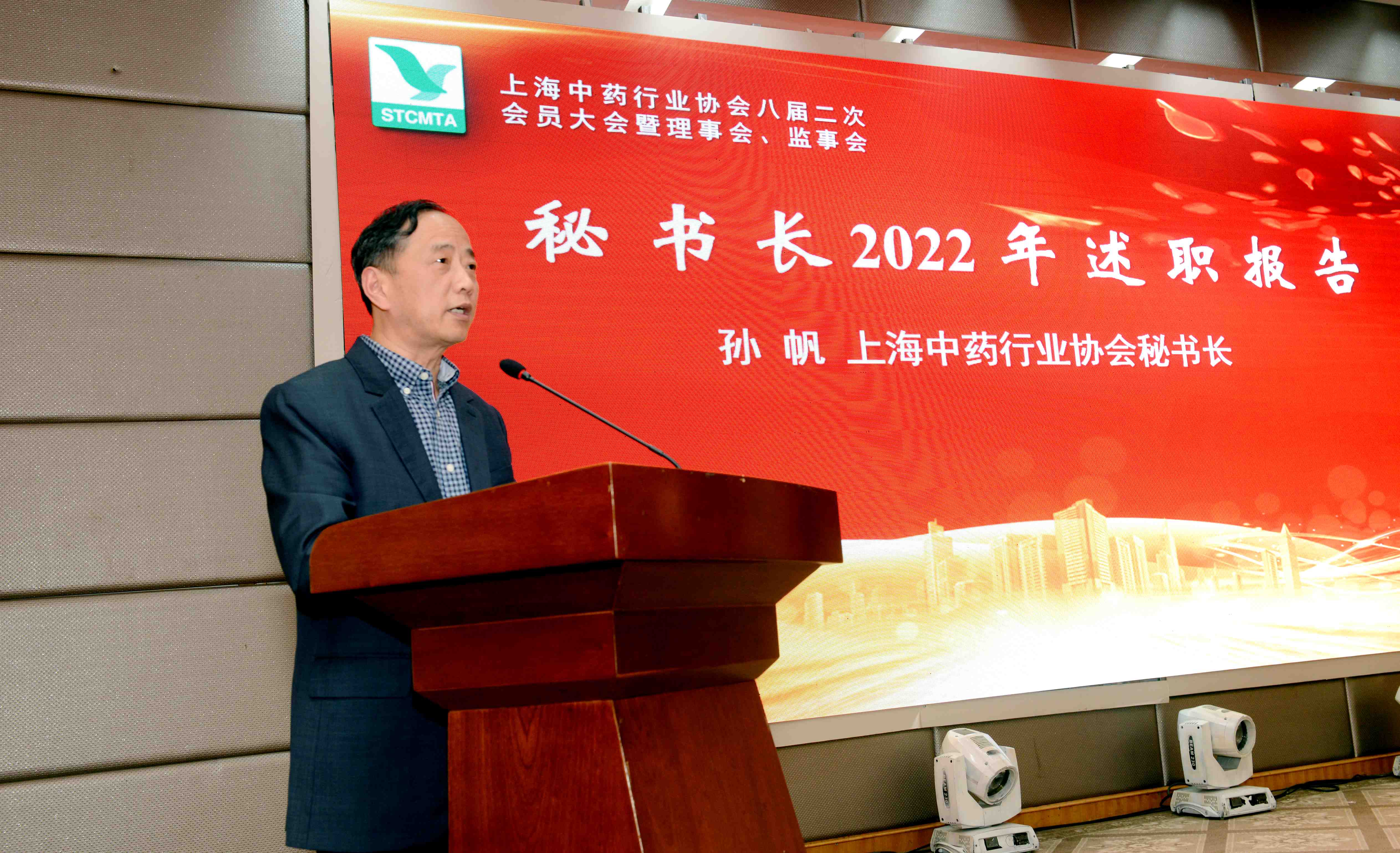 上海中药行业协会秘书长孙帆主持大会,并向大会作《2022年度秘书长述职报告》