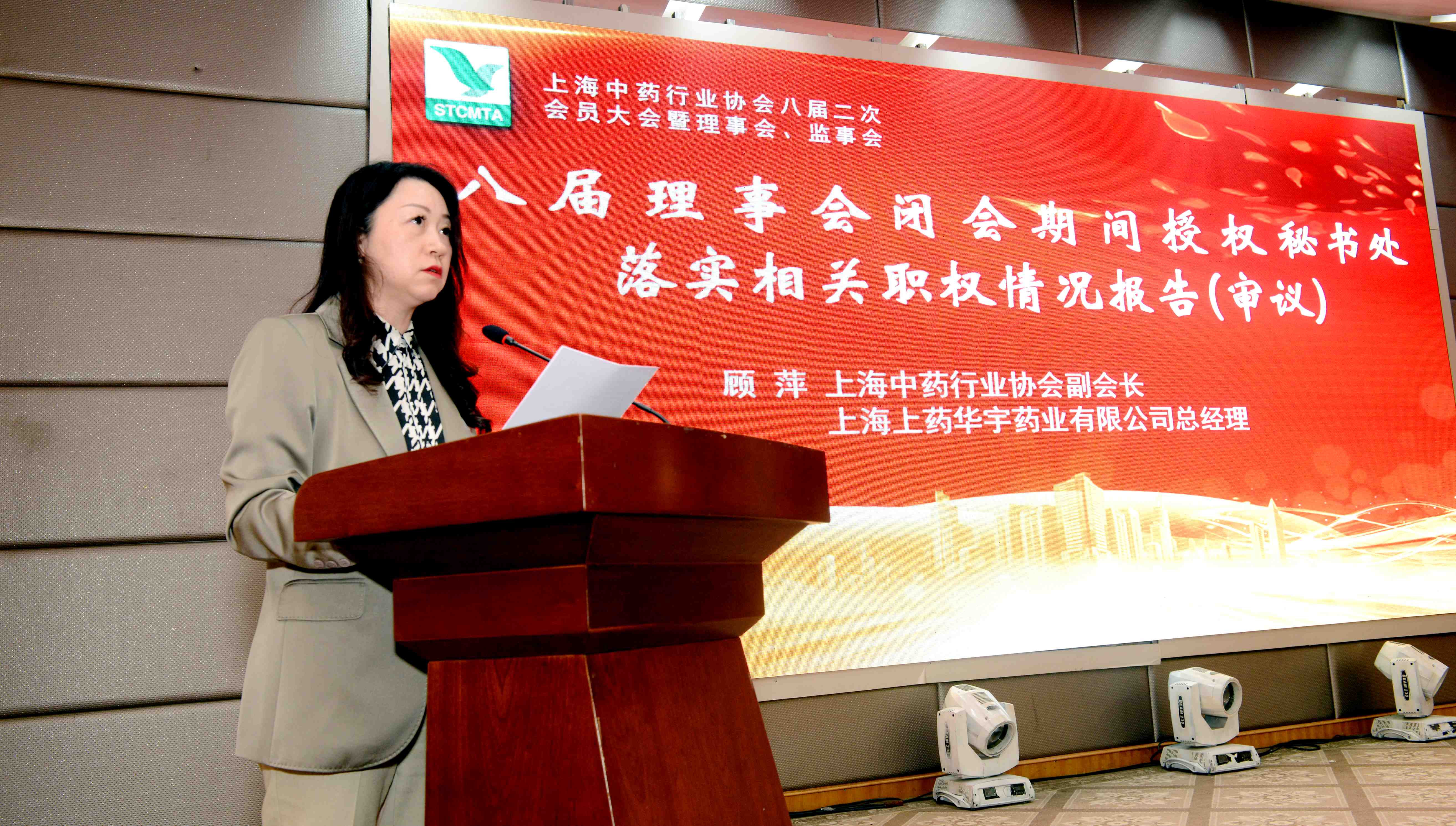 协会副会长、上海上药华宇药业有限公司总经理顾萍作《八届理事会闭会期间授权秘书处落实相关职权情况报告》。
