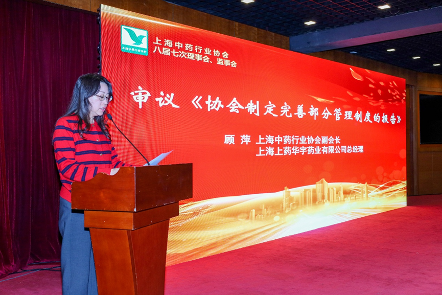 协会副会长、上海上药华宇药业有限公司总经理顾萍作《协会制定完善部分管理制度的报告》。