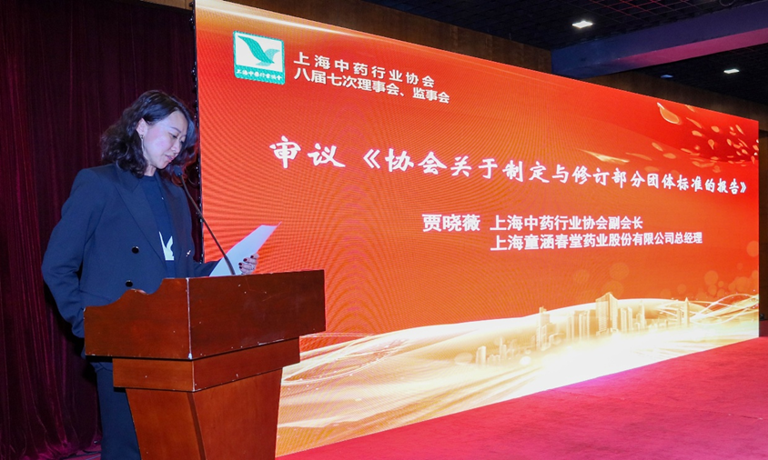 协会副会长、上海童涵春堂药业股份有限公司总经理贾晓薇作《协会关于制定与修订部分团体标准的报告》。