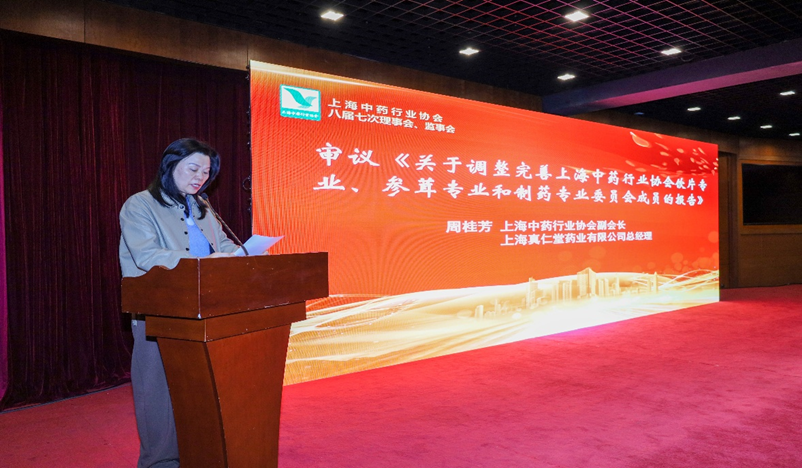 协会副会长、上海真仁堂药业有限公司总经理周桂芳作《调整完善上海中药行业协会饮片专业、参茸专业和制药专业委员会成员的报告》。