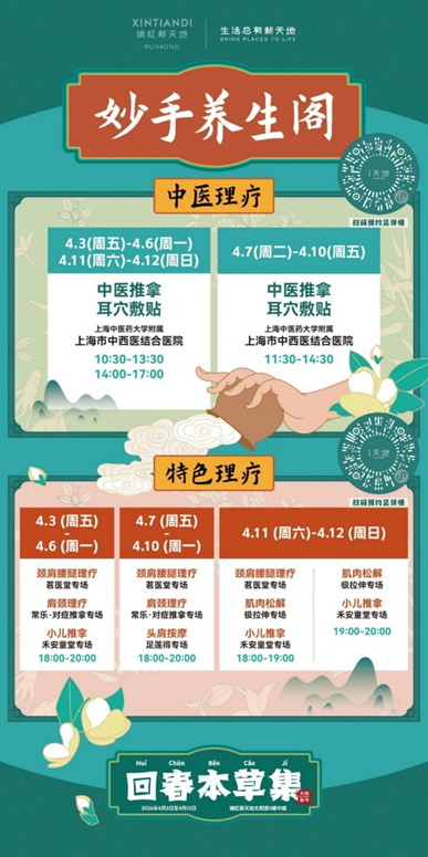 启动仪式后,瑞虹新天地回春本草集正式开市,名医问诊、理疗快充、本草美食、文创好物、手作体验等于一体的中医药文化市集轮番登场。活动不仅好玩,更好买。瑞虹新天地联动场内苍山、虹潮荟、紫玥轩等多家餐饮商户推出 “寻味本草”特色菜品,零售及康养服务品牌也推出“回春指南”体验套餐,将文化热度直接转化为消费动力,让中华优秀传统文化的传承有创新表达。活动 4 月 3 日至 4 月 12 日为期10天,瑞虹新天地 “回春本草集” 将载誉升级、重磅回归,以更专业、更沉浸、更有趣的方式,让千年中医药文化走进都市年轻人的生活场景,为消费者带来一场可感、可触、可体验的中式养生体验。