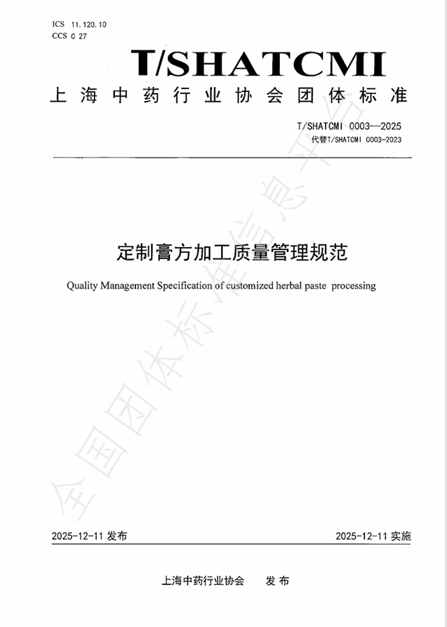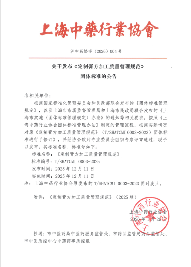 关于发布《定制膏方加工质量管理规范》 团体标准的公告